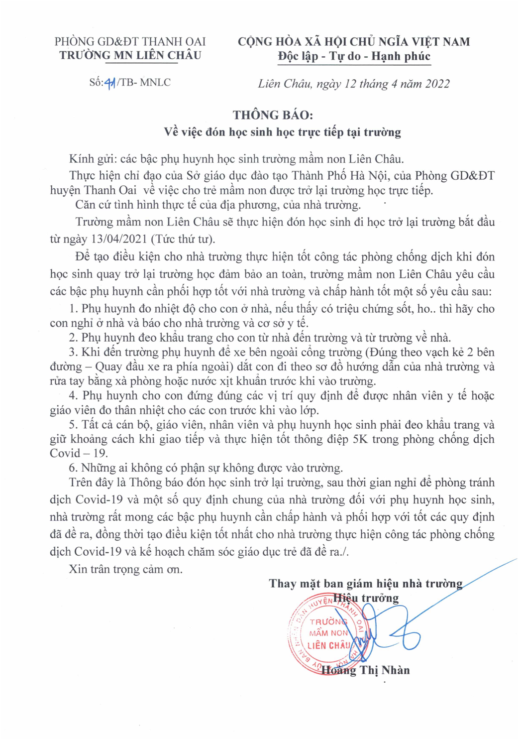 Trên đây là Thông báo đón học sinh trở lại trường, sau thời gian nghỉ để phòng tránh dịch Covid-19 và một số quy định chung của nhà trường đối với phụ huynh học sinh, nhà trường rất mong các bậc phụ huynh cần chấp hành và phối hợp với tốt các quy định đã đề ra, đồng thời tạo điều kiện tốt nhất cho nhà trường thực hiện công tác phòng chống dịch Covid-19 và kế hoạch chăm sóc giáo dục trẻ đã đề ra./.