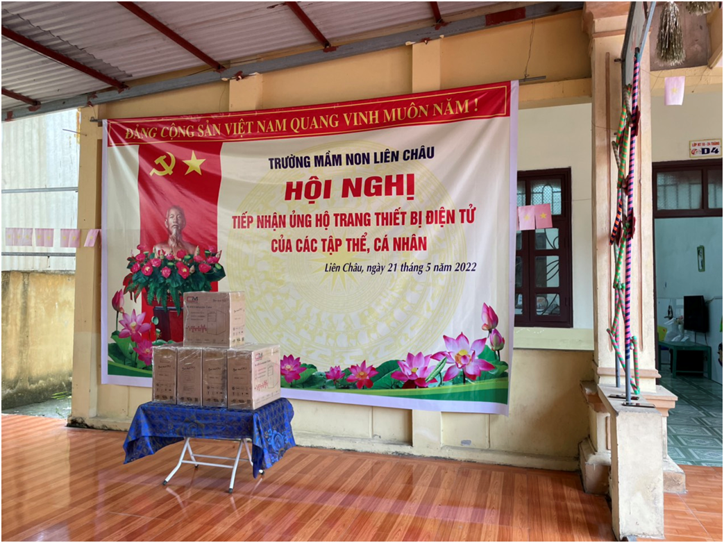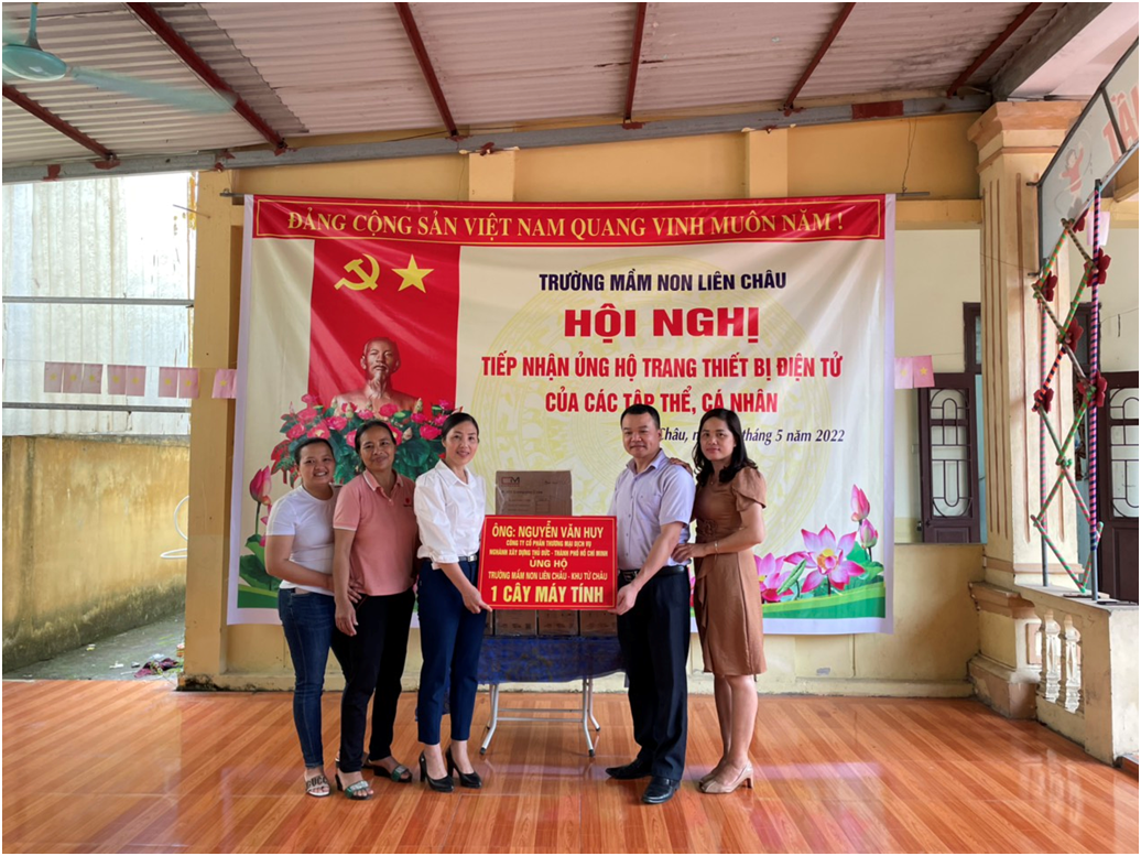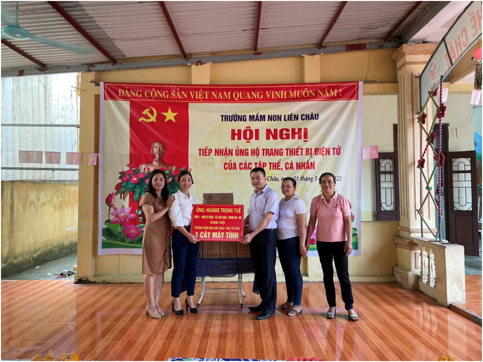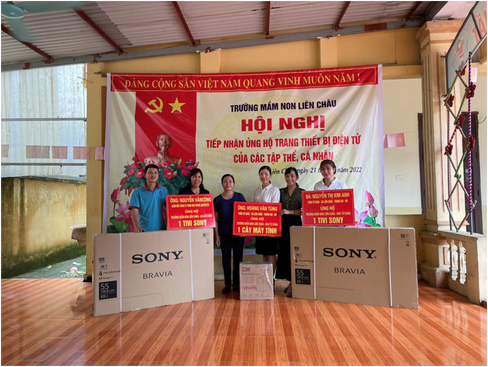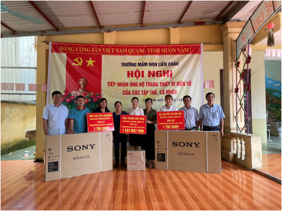Năm học 2021- 2022 là một năm đặc biệt vì các con không được tới trường trong thời gian nghỉ dịch Covid-19 kéo dài. Ngày 13/4/2022 là ngày tất cả các con ở độ tuổi mầm non được đến trường, đến lớp. Cô và trò trường mầm non Liên Châu háo hức, phấn khởi khi được đến trường đi học, đi dạy trở lại. Với niềm vui đó niềm vui lại được tăng thêm gấp nhiều lần khi mà được các tập thể, các quý công ty, các cá nhân, các mạnh thường hỗ trợ ủng hộ cho cô và trò trường mầm non Liên Châu 06 cây vi tính và 02 chiếc ti vi Sony 55 Inch để các con được tiếp tục được trải nghiêm trên màm ảnh nhỏ vì thời gian nghỉ dịch lâu kèm theo đồ dùng trang thiết bị sử dụng lâu năm đã hỏng và xuống cấp, nhất là các thiết bị điện tử như ti vi, máy tính đa số hỏng nhiều. Ban giám hiệu nhà trường phối hợp với Ban đại diện Cha mẹ học sinh nhờ sự giúp đỡ của các bác lãnh đạo xã, lãnh đạo thôn, các bác lãnh đạo đã nghỉ hưu và nhất là Ông nguyễn Công Khoái- Phó bí thư TTĐU, chủ tịch HĐND xã tư vấn, kêu gọi sự giúp đỡ của Các tập thể, các quý công ty, các cá nhân , các mạnh thường quân ủng hộ cho nhà trường . Dưới đây là danh sách các tập thể, các quý công ty, các cá nhân, các mạnh thường quân ủng hộ cho nhà trường.