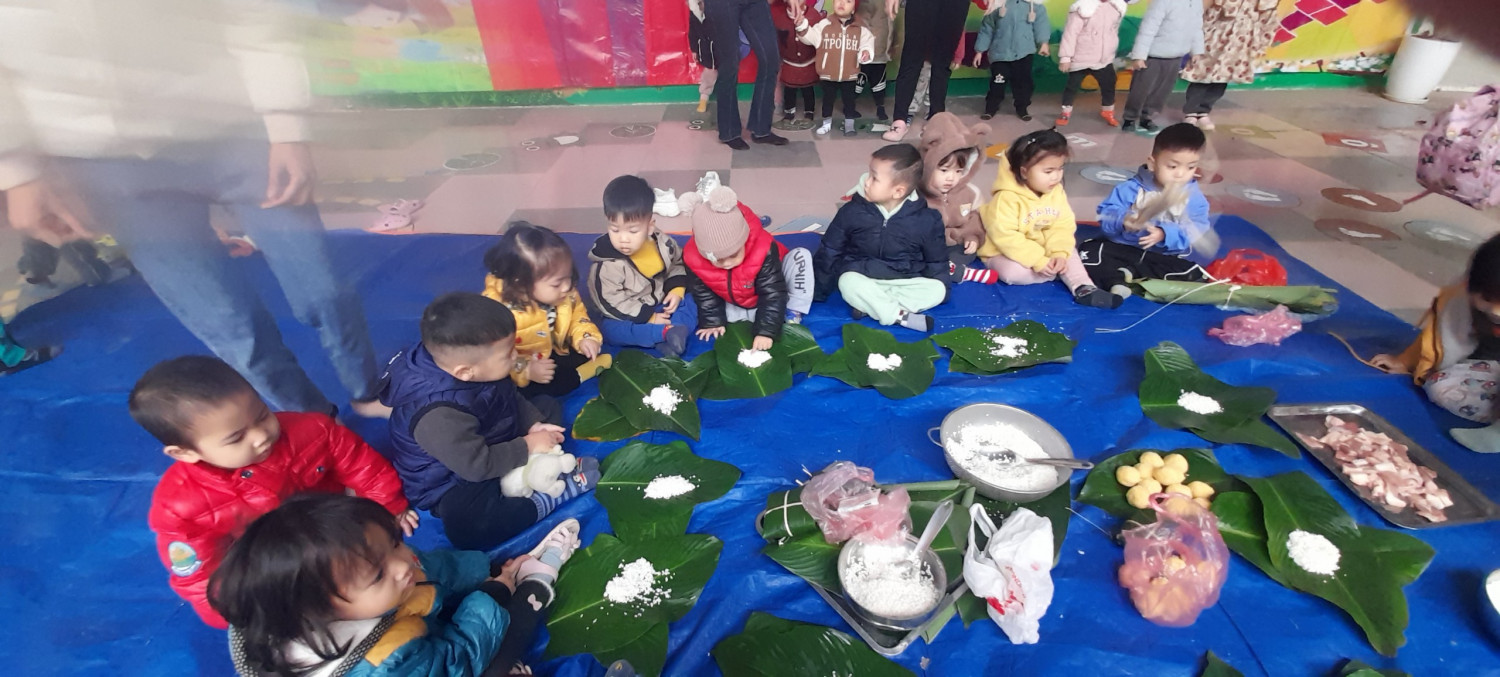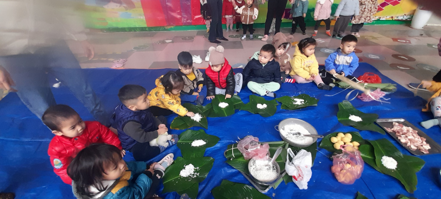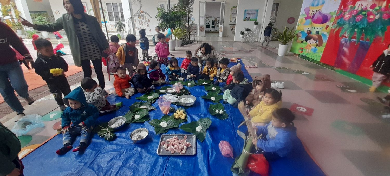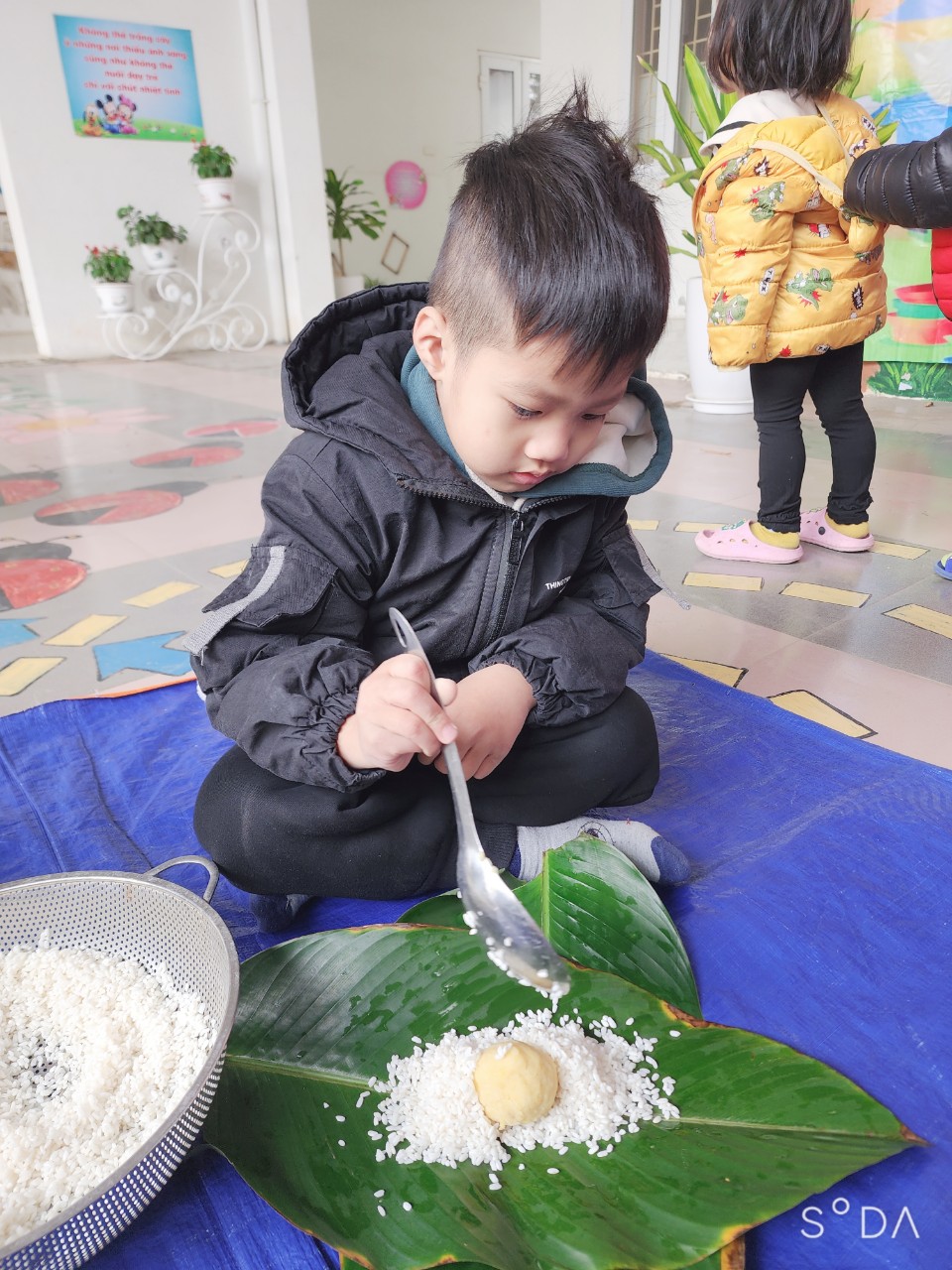 Thông qua hoạt động này các Bé được trải nghiệm và tích lũy được thêm nhiều kỹ năng sống: Trẻ biết được để làm ra những chiếc bánh chưng cần những nguyên liệu quen thuộc như: Lá dong, gạo nếp, nhân đỗ, thịt và dây lạt. Trẻ được quan sát các cô gói bánh chưng. Những ánh mắt long lanh của các con đang dõi theo cô gói từng chiếc bánh, dưới bàn tay của cô chiếc bánh dần hiện ra với một sắc xanh bóng mượt của lá dong gói gọn trong những dây lạt. Chiếc bánh chưng đã hoàn thành trong tiếng trầm trồ của các Bé, bạn nào cũng muốn được gói chiếc bánh ấy. Sau đó, các Bé được cô hướng dẫn xếp lá, cho nguyên liệu để gói những chiếc bánh chưng cho riêng mình. Lần đầu gói chiếc bánh chưng đầy bỡ ngỡ, từ giai đoạn đặt lá cho chiếc bánh, nhiều Bé cảm thấy đây là một việc đầy khó khăn, nhưng dưới sự hướng dẫn tỉ mỉ của cô, các Bé đều không nản chí và cố gắng hoàn thành chiếc bánh của mình. Chiếc bánh có thể méo, có thể không đẹp nhưng đó là một thành quả nỗ lực của các Bé, các Bé tự hào về chiếc bánh mình tự tay gói.