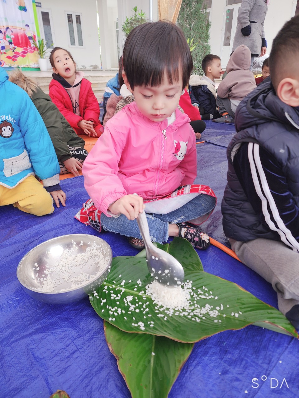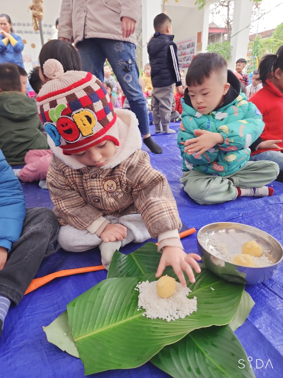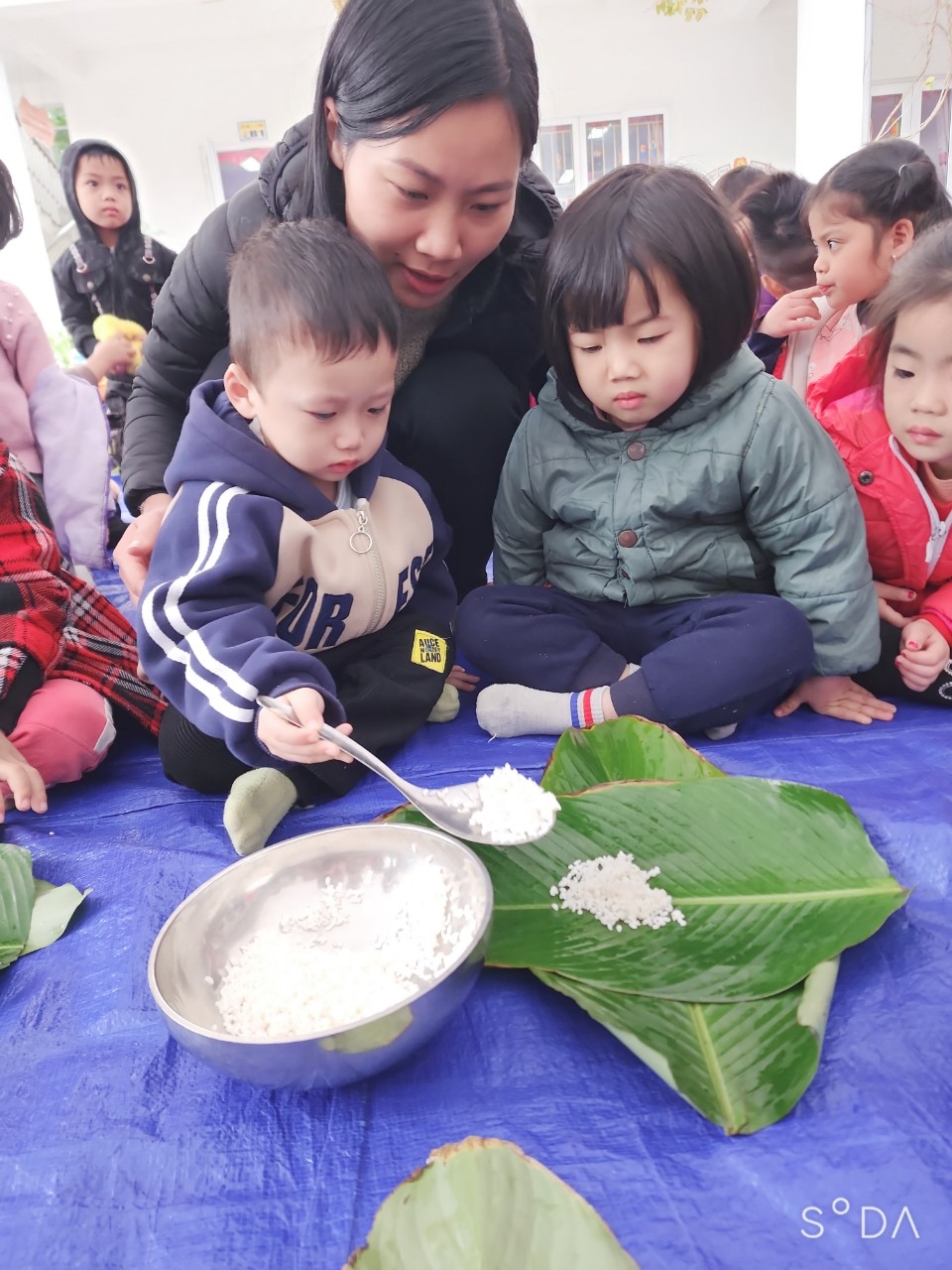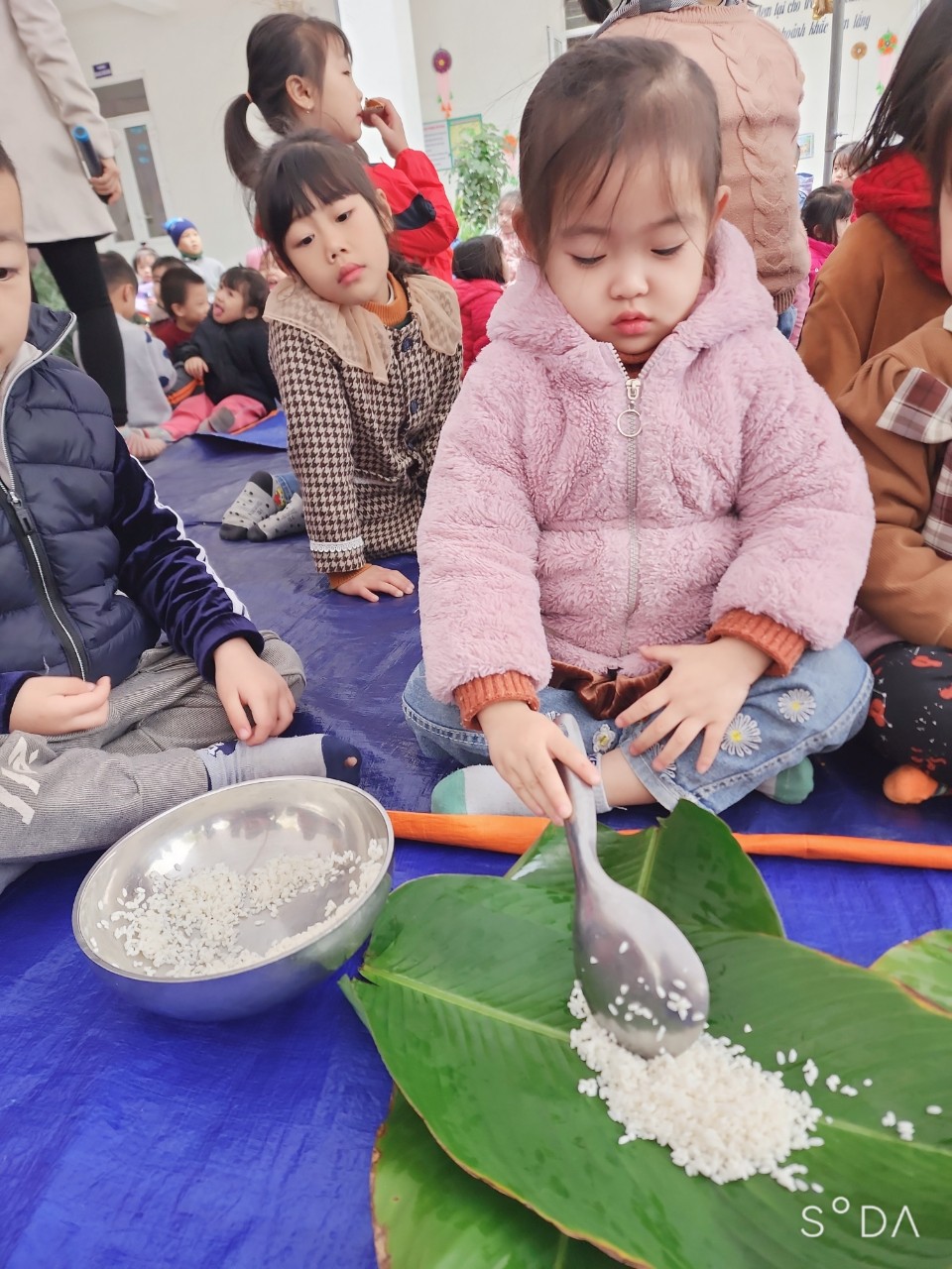 Thông qua hoạt động này các Bé được trải nghiệm và tích lũy được thêm nhiều kỹ năng sống: Trẻ biết được để làm ra những chiếc bánh chưng cần những nguyên liệu quen thuộc như: Lá dong, gạo nếp, nhân đỗ, thịt và dây lạt. Trẻ được quan sát các cô gói bánh chưng. Những ánh mắt long lanh của các con đang dõi theo cô gói từng chiếc bánh, dưới bàn tay của cô chiếc bánh dần hiện ra với một sắc xanh bóng mượt của lá dong gói gọn trong những dây lạt. Chiếc bánh chưng đã hoàn thành trong tiếng trầm trồ của các Bé, bạn nào cũng muốn được gói chiếc bánh ấy. Sau đó, các Bé được cô hướng dẫn xếp lá, cho nguyên liệu để gói những chiếc bánh chưng cho riêng mình. Lần đầu gói chiếc bánh chưng đầy bỡ ngỡ, từ giai đoạn đặt lá cho chiếc bánh, nhiều Bé cảm thấy đây là một việc đầy khó khăn, nhưng dưới sự hướng dẫn tỉ mỉ của cô, các Bé đều không nản chí và cố gắng hoàn thành chiếc bánh của mình. Chiếc bánh có thể méo, có thể không đẹp nhưng đó là một thành quả nỗ lực của các Bé, các Bé tự hào về chiếc bánh mình tự tay gói.