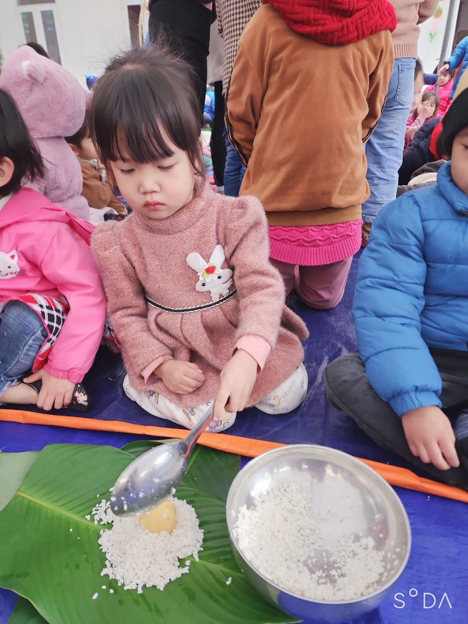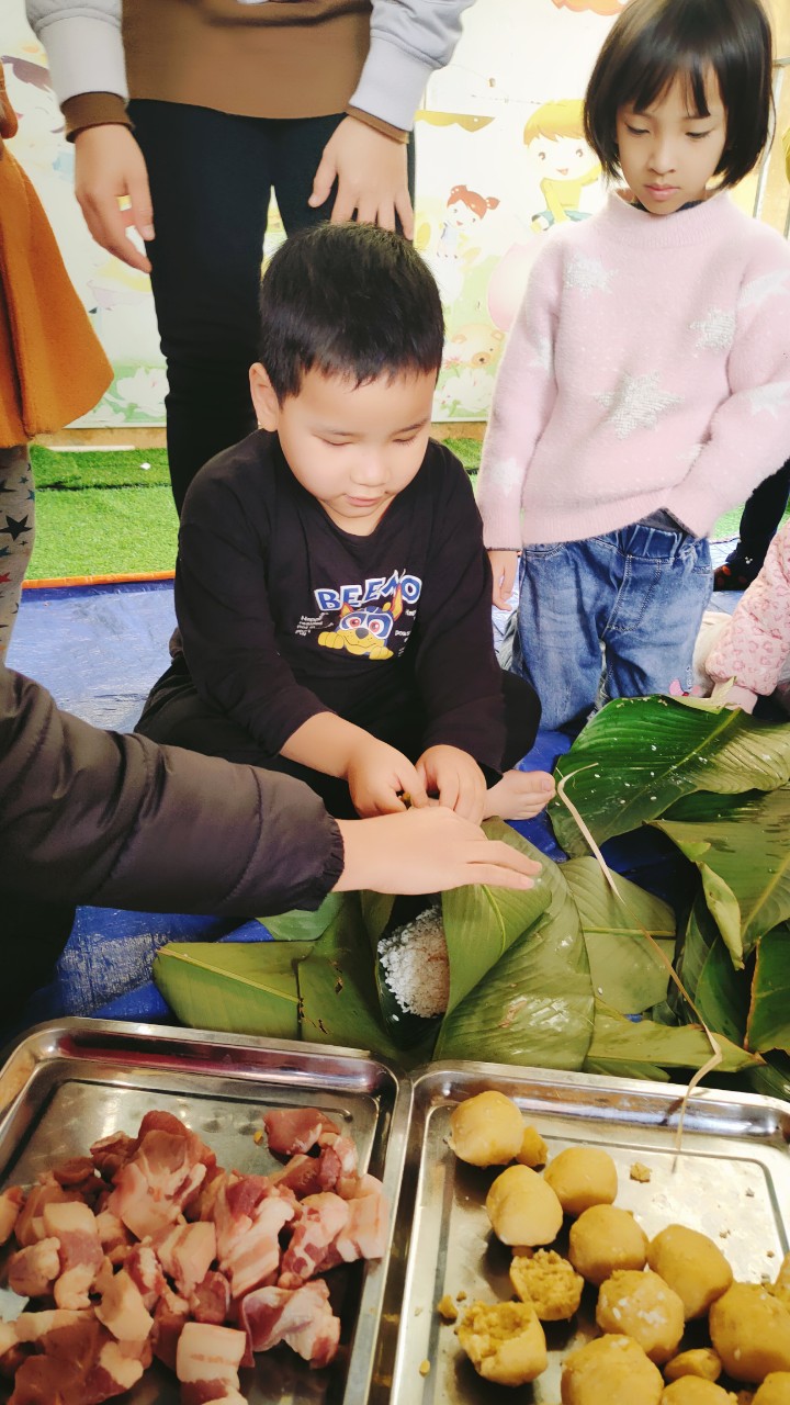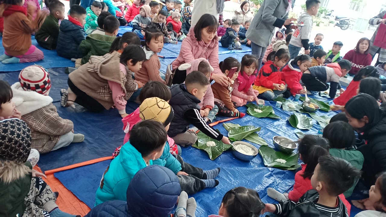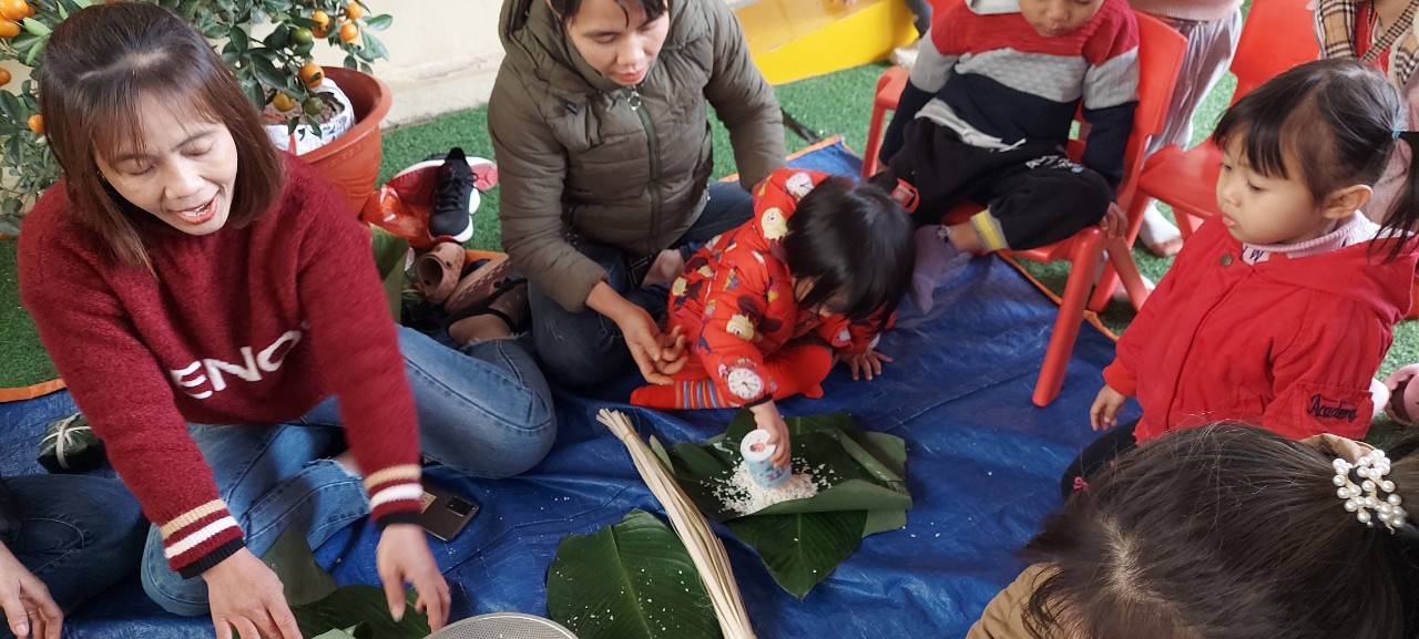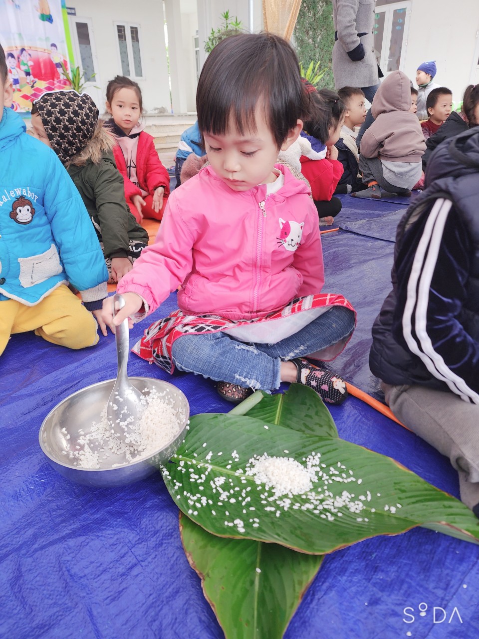Thông qua hoạt động này các Bé được trải nghiệm và tích lũy được thêm nhiều kỹ năng sống: Trẻ biết được để làm ra những chiếc bánh chưng cần những nguyên liệu quen thuộc như: Lá dong, gạo nếp, nhân đỗ, thịt và dây lạt. Trẻ được quan sát các cô gói bánh chưng. Những ánh mắt long lanh của các con đang dõi theo cô gói từng chiếc bánh, dưới bàn tay của cô chiếc bánh dần hiện ra với một sắc xanh bóng mượt của lá dong gói gọn trong những dây lạt. Chiếc bánh chưng đã hoàn thành trong tiếng trầm trồ của các Bé, bạn nào cũng muốn được gói chiếc bánh ấy. Sau đó, các Bé được cô hướng dẫn xếp lá, cho nguyên liệu để gói những chiếc bánh chưng cho riêng mình. Lần đầu gói chiếc bánh chưng đầy bỡ ngỡ, từ giai đoạn đặt lá cho chiếc bánh, nhiều Bé cảm thấy đây là một việc đầy khó khăn, nhưng dưới sự hướng dẫn tỉ mỉ của cô, các Bé đều không nản chí và cố gắng hoàn thành chiếc bánh của mình. Chiếc bánh có thể méo, có thể không đẹp nhưng đó là một thành quả nỗ lực của các Bé, các Bé tự hào về chiếc bánh mình tự tay gói.