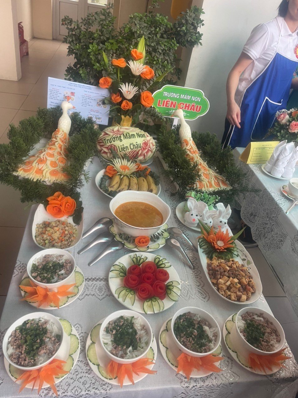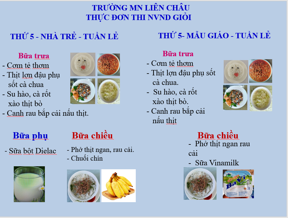 Thực đơn cô Phạm Thị Yến dự thi được cân đối về tỉ lệ các chất dinh dưỡng, đảm bảo vệ sinh an toàn thực phẩm và cách chế biến phù hợp với trẻ.