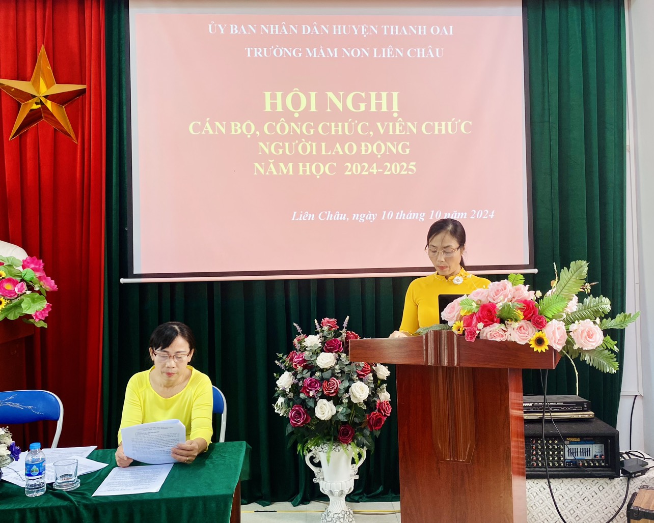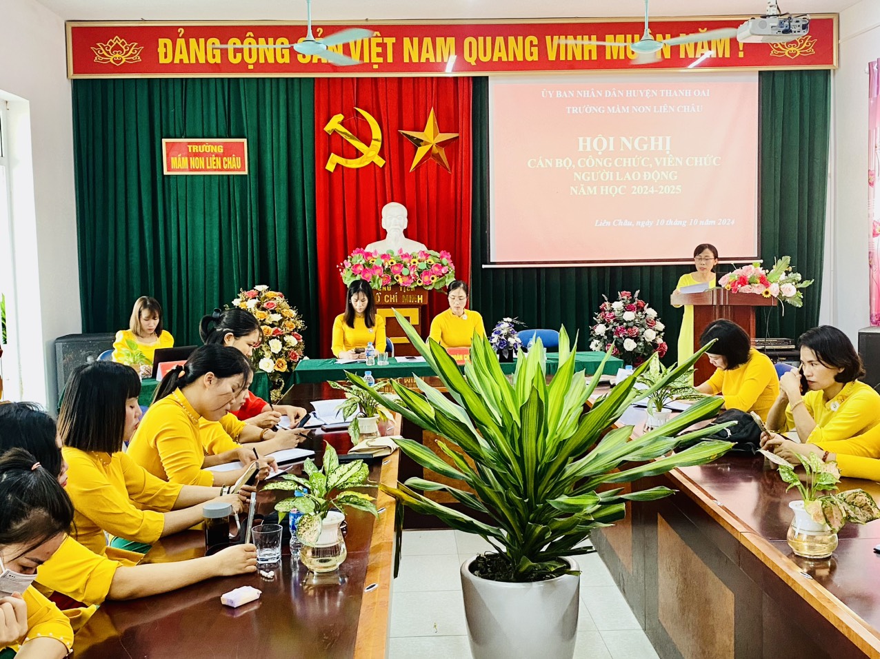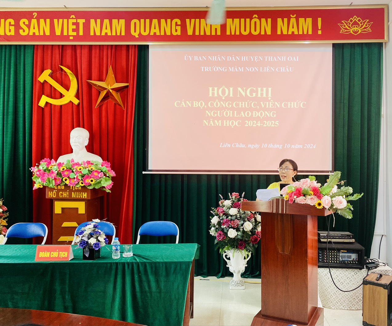 Hội nghị cán bộ viên chức, người lao động năm học 2024 - 2025 của Trường mầm non Liên Châu đã tạo không khí thi đua sôi nổi, tinh thần Đoàn kết – Chung sức – Chung lòng - Phấn đấu đạt được kết quả cao trong năm học đề ra.